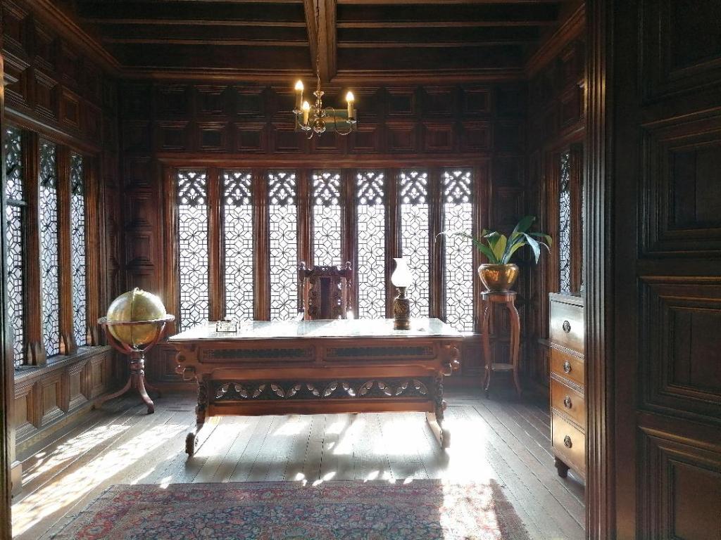 After eating, I headed to the visitor centre. There, I bought a £5 ticket for a self-guided tour of Bramall Hall. At the entrance, I was given a floor plan to follow and began on the one way system tour. It was incredibly captivating, most of the hall was set up to imitate how the Victorian occupants had lived their everyday lives. Because the site dates back to the early medieval period, some of the rooms were in the original or Tudor style. Each room had an information plaque explaining their main uses, including notable people and relevant events. I watched two videos which went into detail on some of the more intriguing architectural articles of the hall. Unusually, they also placed pine cones on many of the chairs and beds. These were a novel replacement for ‘do not sit’ signs, as a lot of the furniture was old and fragile. I’m not sure how well it worked though!